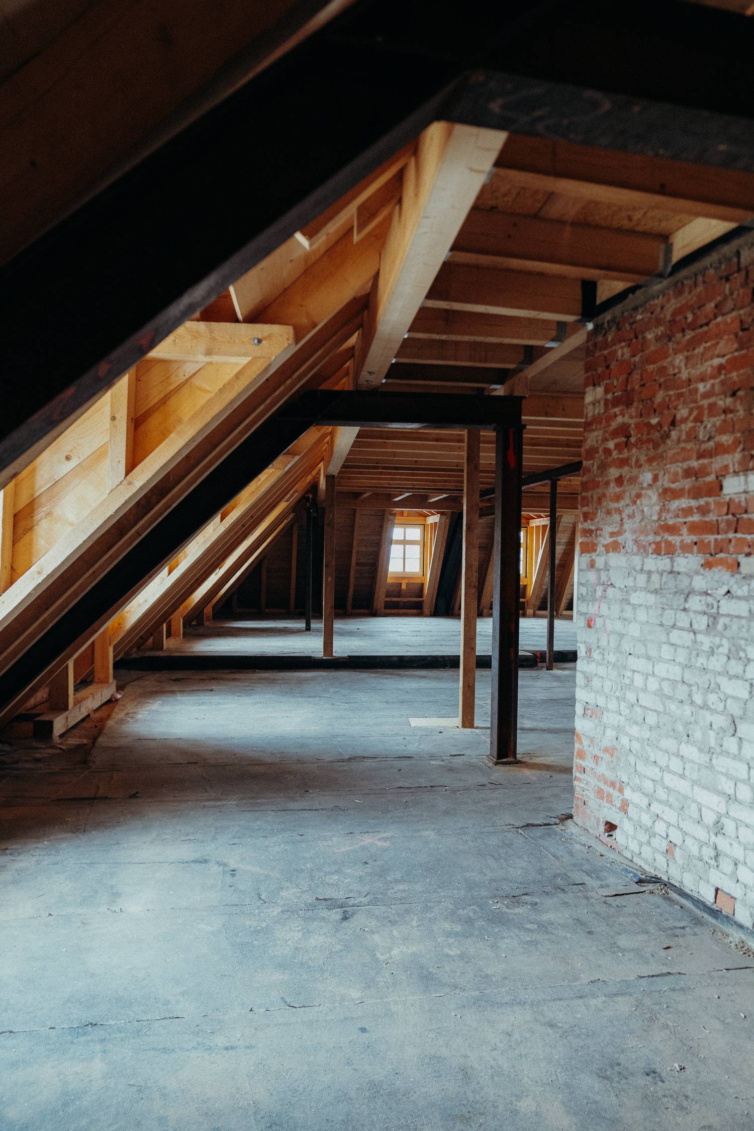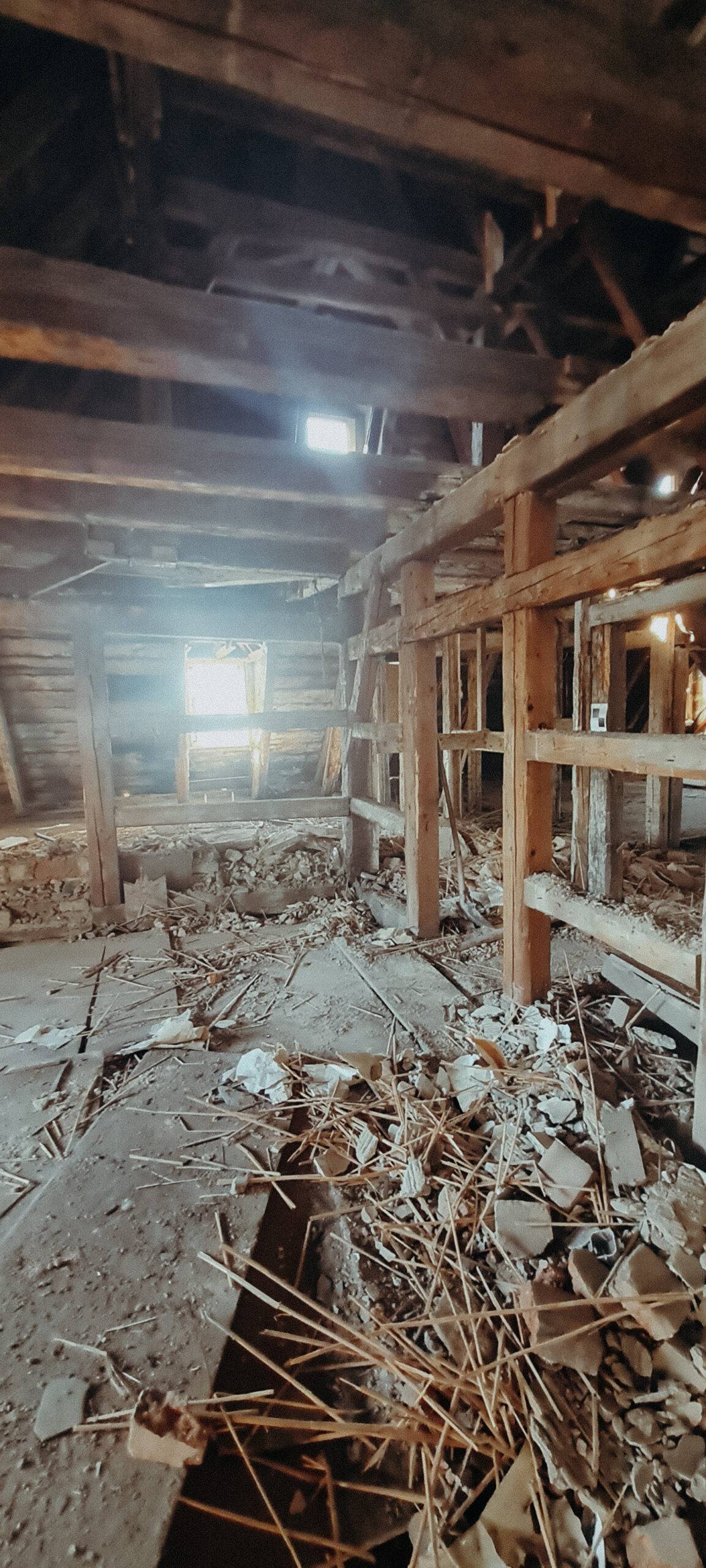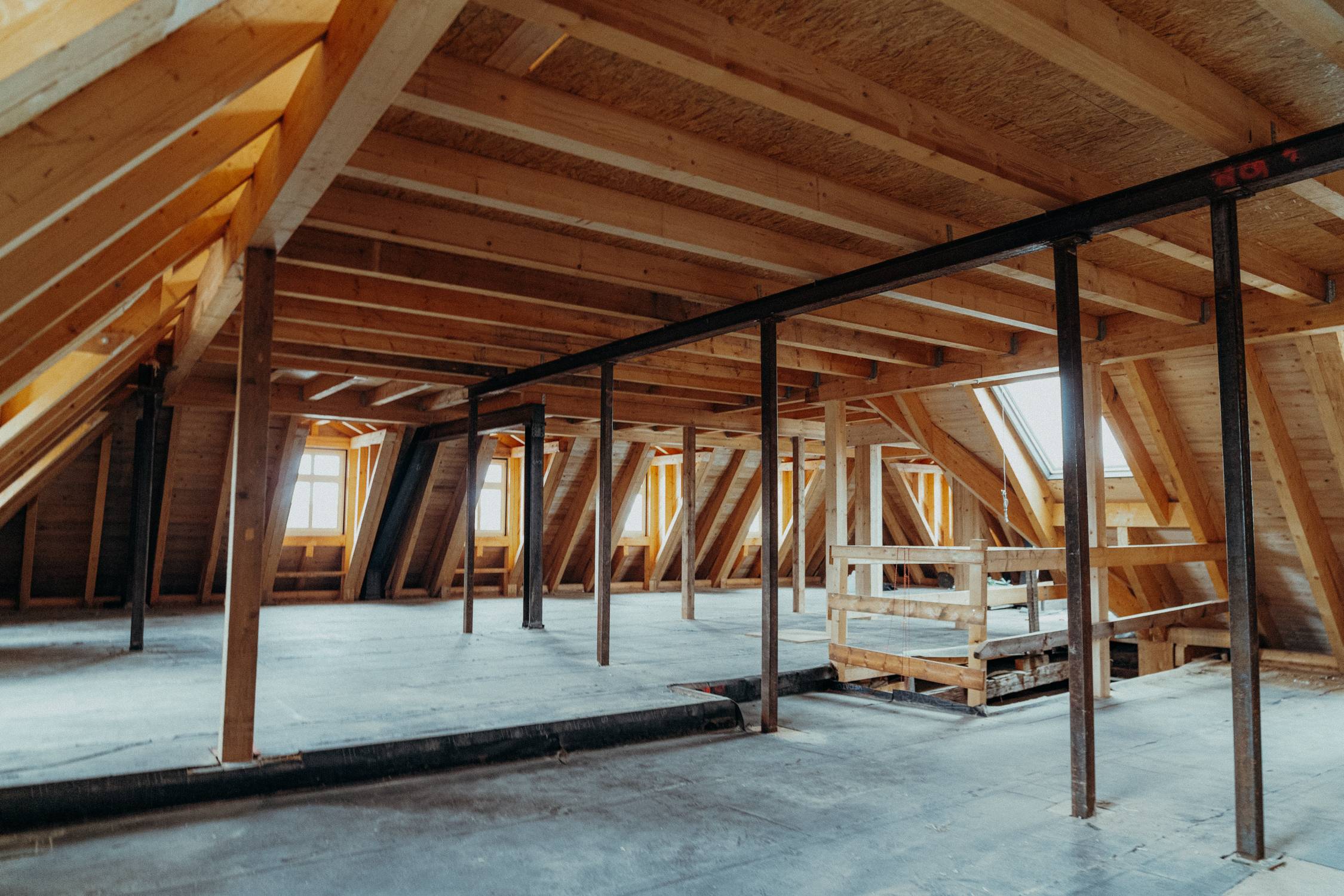 Besondere Aufmerksamkeit lag auf dem Ausgleich der Deckenbalkenlage mit rund 560 Quadratmetern Fläche. Hier war exaktes Arbeiten entscheidend, damit die gesamte Konstruktion später sauber sitzt.